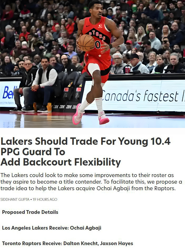 对于阿巴基,美媒《Fadeaway World》建议湖人去追这位25岁的即战力,给出的交易方案为送出克内克特和海斯。