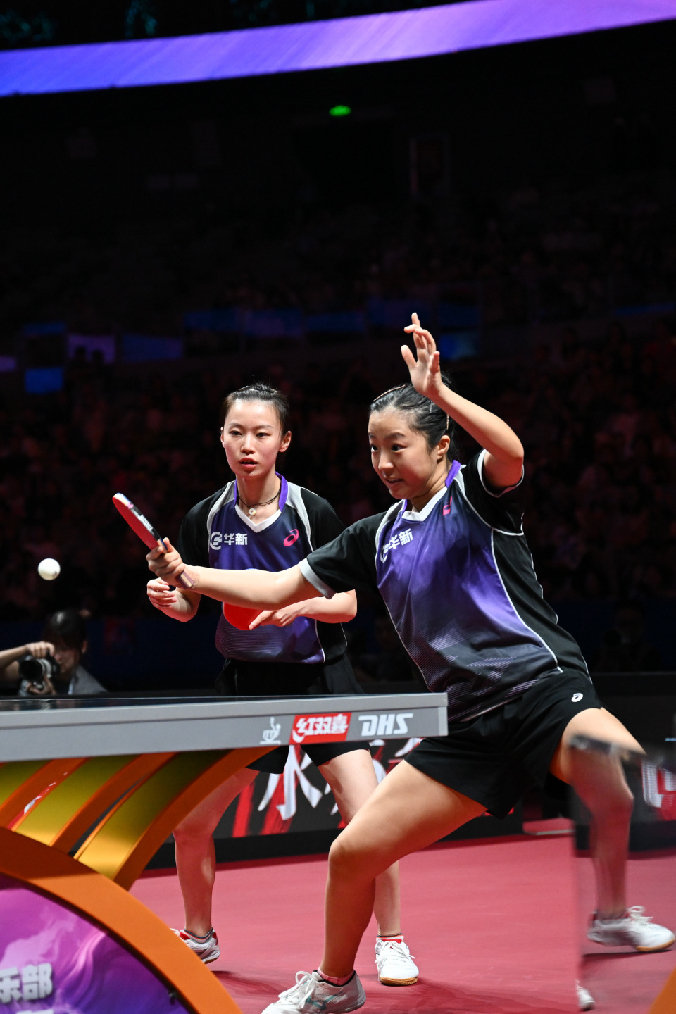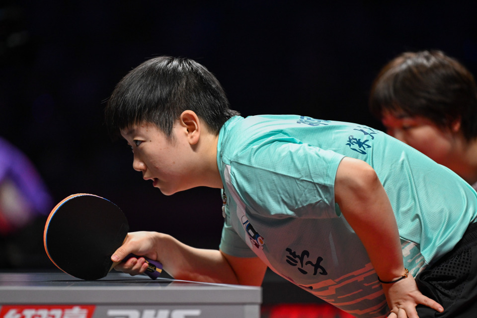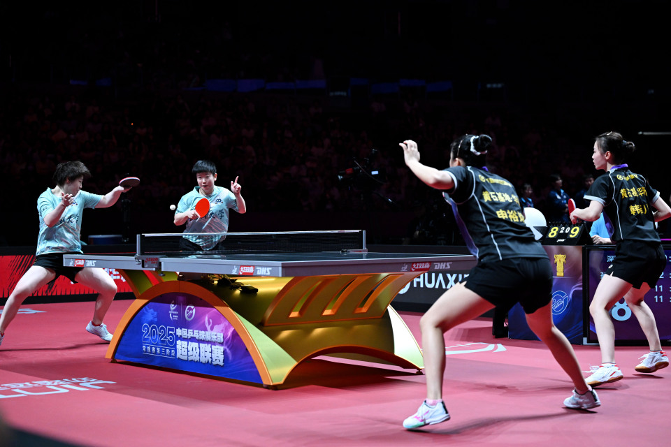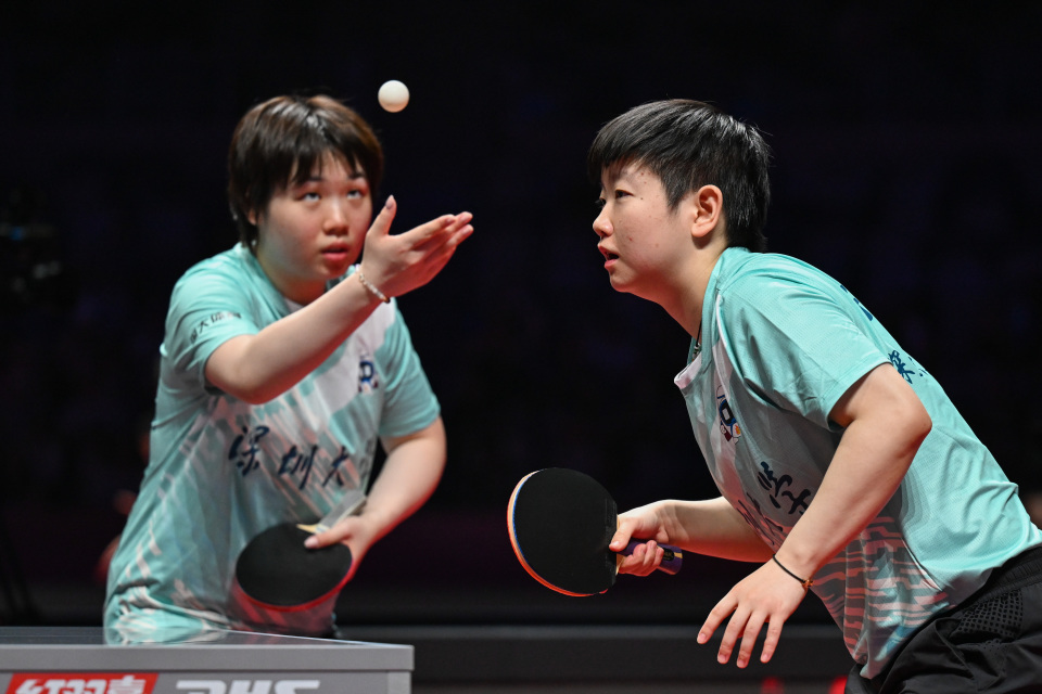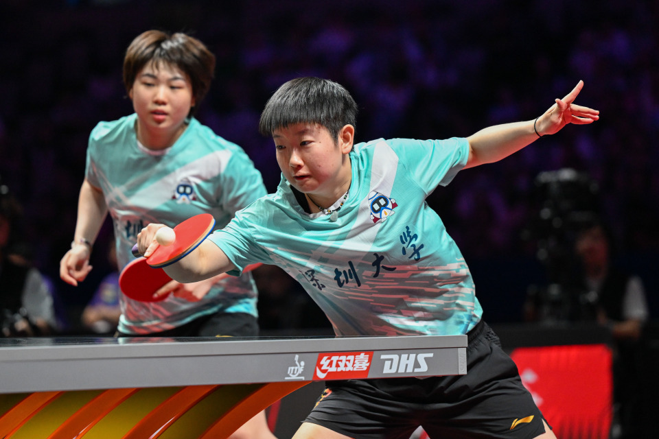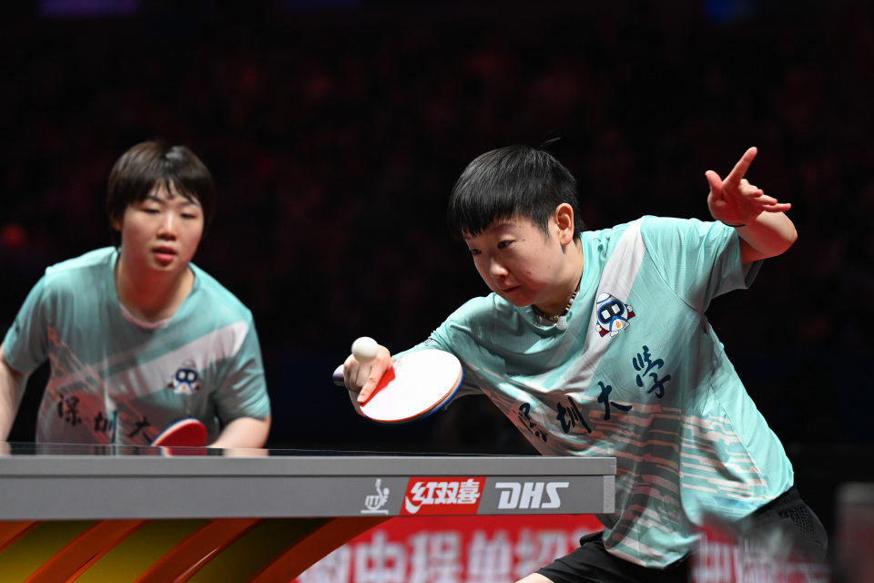8月30日,深圳大学队组合孙颖莎/蒯曼(前)在比赛中。她们在双打比赛中3比1战胜黄石华新队组合韩菲儿/申裕斌。新华社记者 丁磊 摄