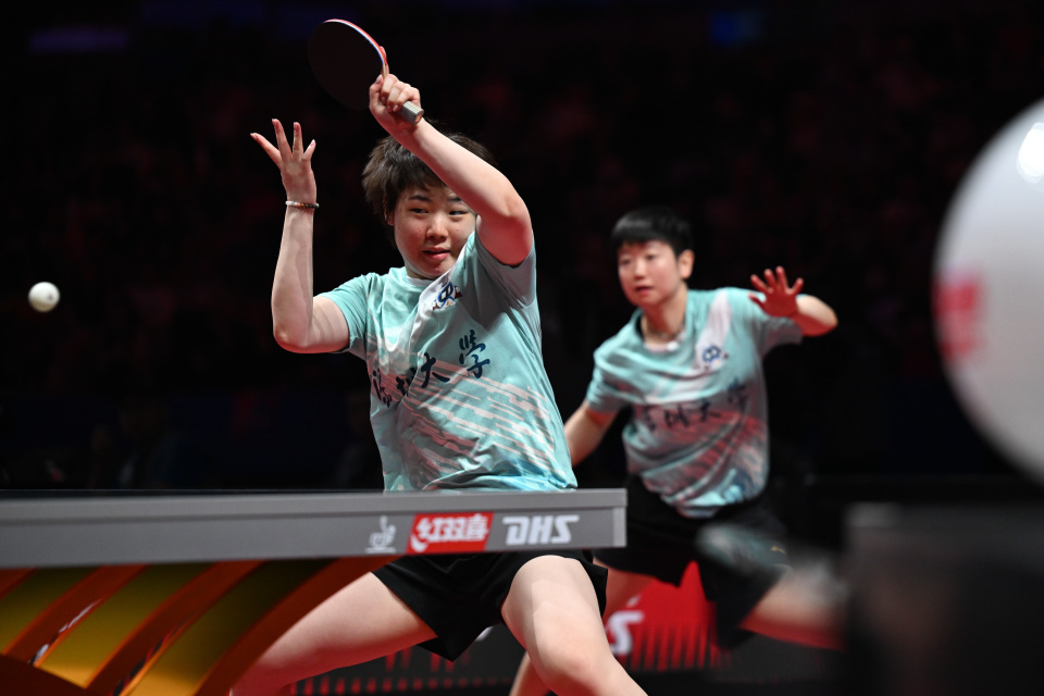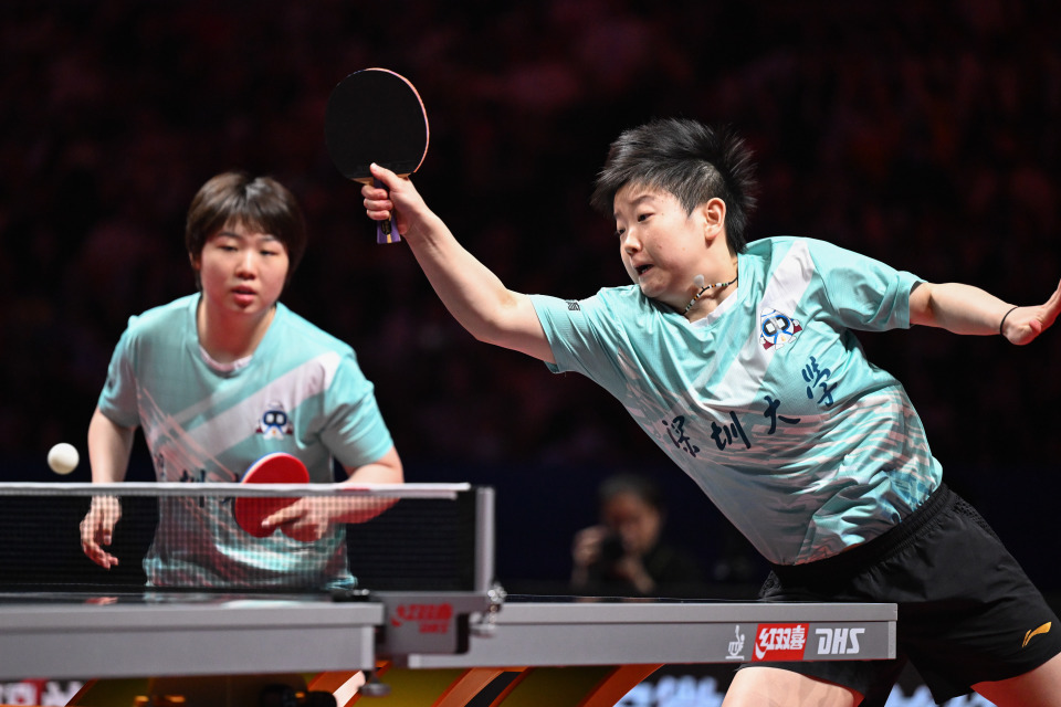 8月30日,深圳大学队组合孙颖莎/蒯曼(左)在比赛中。她们在双打比赛中3比1战胜黄石华新队组合韩菲儿/申裕斌。新华社记者 丁磊 摄