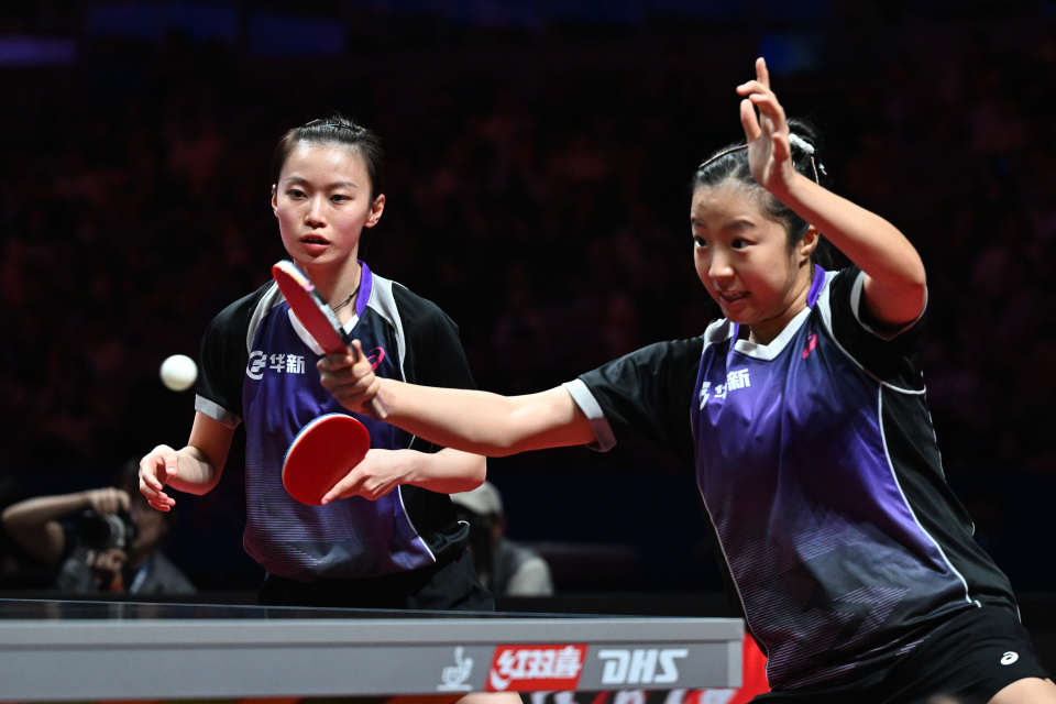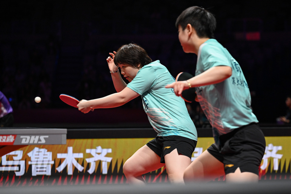 8月30日,黄石华新队组合韩菲儿/申裕斌(右)在比赛中。她们在双打比赛中1比3不敌深圳大学队组合孙颖莎/蒯曼。新华社记者 丁磊 摄