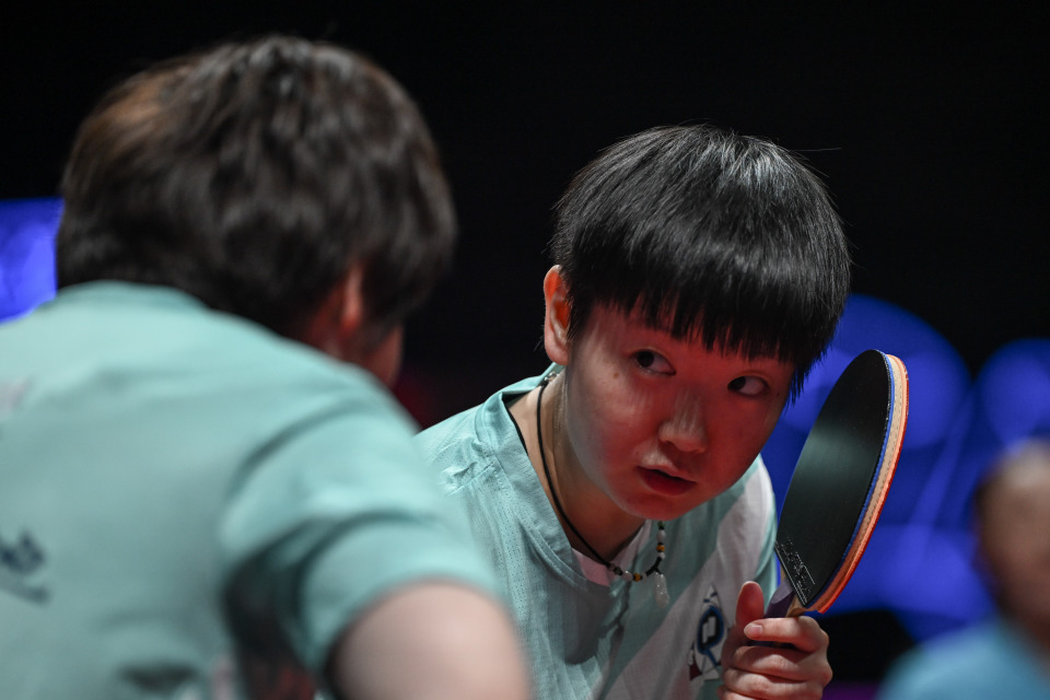 8月30日,深圳大学队组合孙颖莎(左二)/蒯曼(左一)和黄石华新队组合韩菲儿/申裕斌(右二)在比赛中。孙颖莎/蒯曼在双打比赛中3比1战胜韩菲儿/申裕斌。新华社记者 丁磊 摄