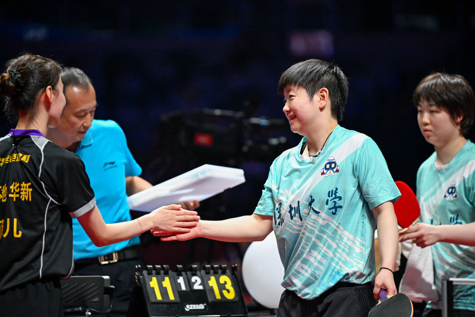 江南体育平台8月30日,深圳大学队组合孙颖莎(右二)/蒯曼在赛后和对手击掌致意。她们在双打比赛中3比1战胜黄石华新队组合韩菲儿/申裕斌。新华社记者 丁磊 摄